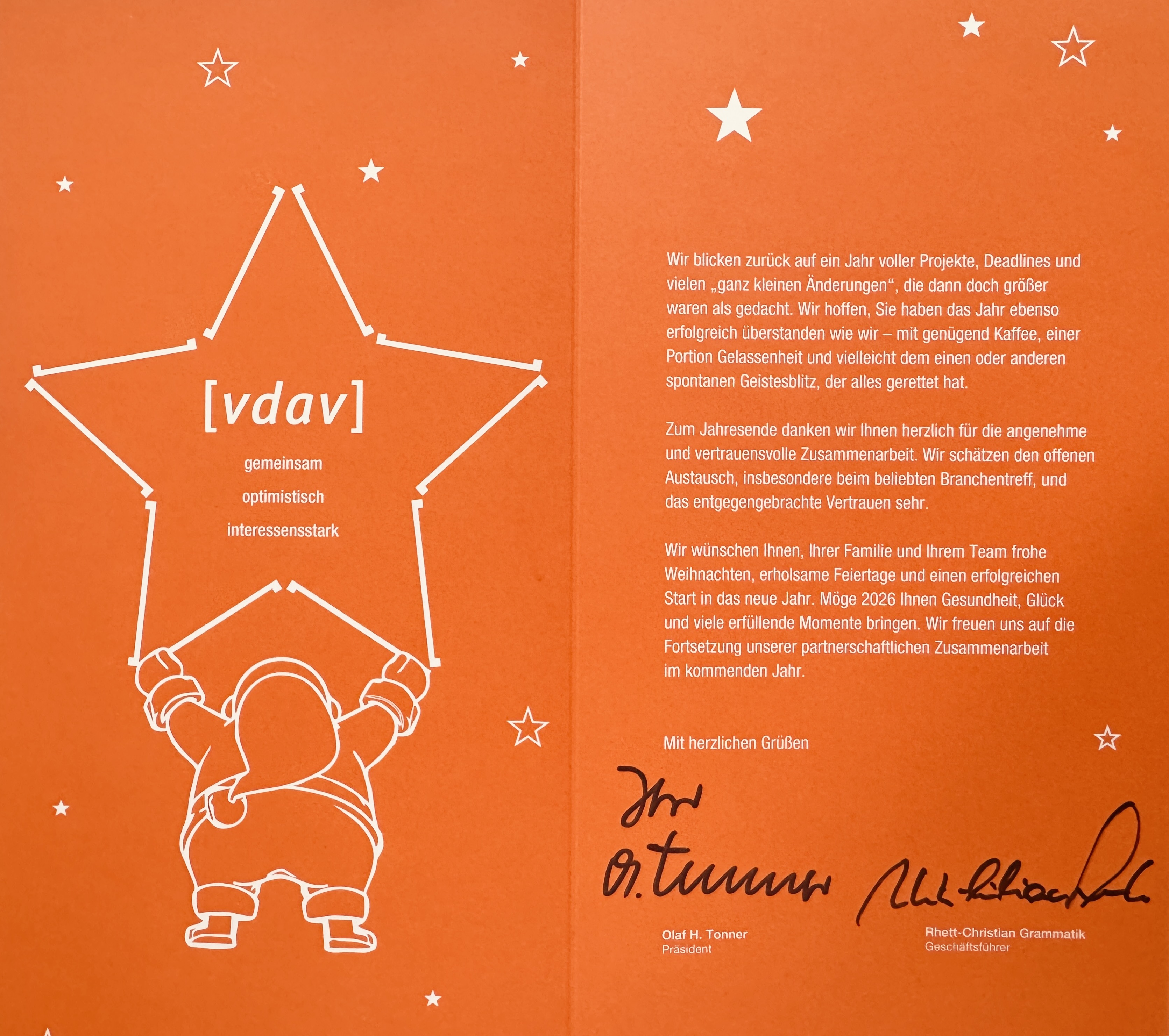 Der [vdav] wünscht ein wunderschönes Weihnachtsfest und einen guten Übergang in ein in jeder Beziehung glückliches und erfolgreiches Jahr 2026. Auf ein Neues in 2026.